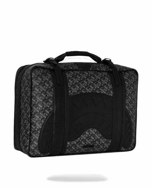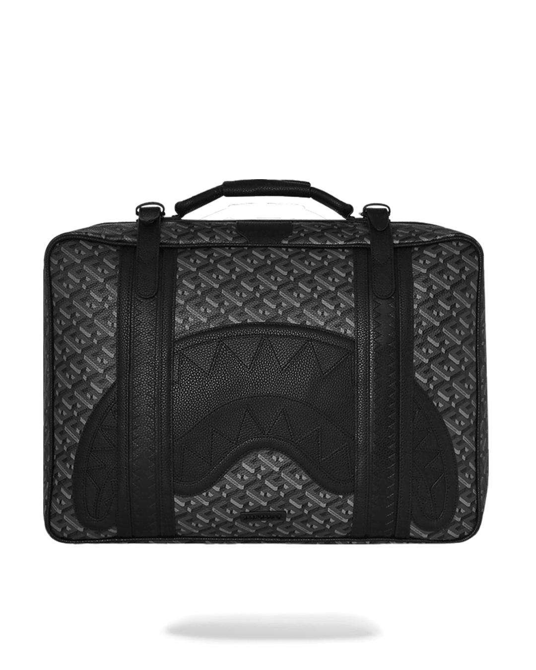 Features: Leather handle, secure buckle closure, whip stitching features, vertical sharkmouth embossed details, converts from backpack to handheld briefcase, embossed sharkmouth, includes luggage tag, 2 exterior zipper pockets, luggage sleeve, 4 interior mesh pockets, large interior pocket, clothing compression straps, includes adjustable backpack straps, embossed zipper pulls.